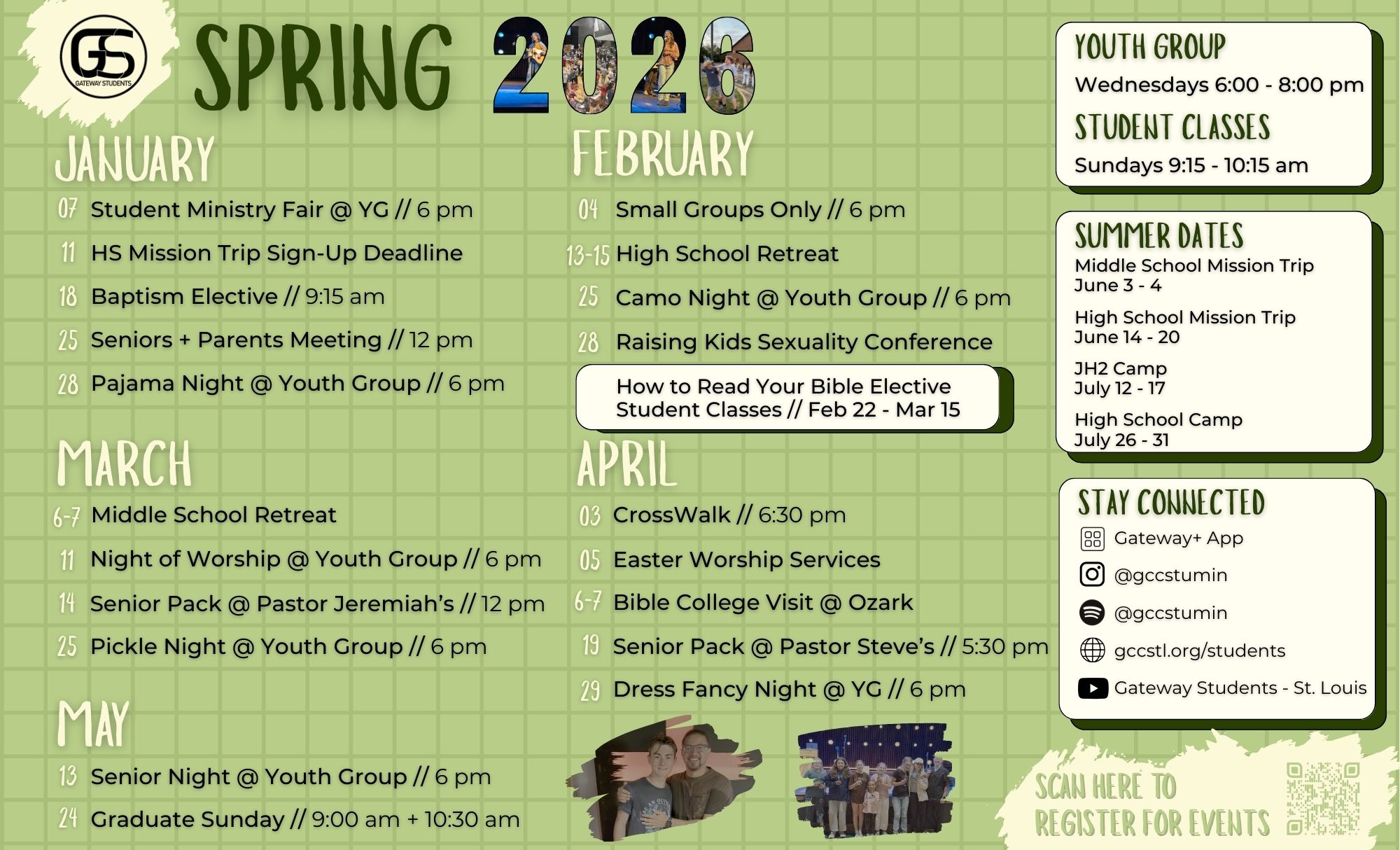 Students get to enjoy a safe environment where they can grow in their relationship with Christ and others. They'll get to hang out, hear from God's word, praise God through worship, and have a time for discussion and connection in an age and gender appropriate small group. Wednesdays are the best! Youth Group meets during the academic school year with activities during the summer.